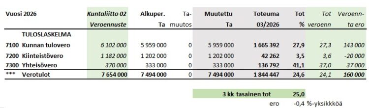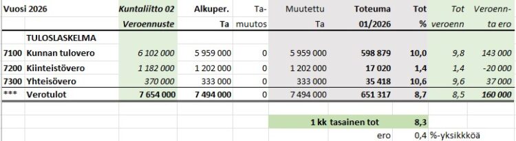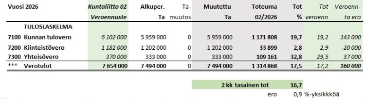 - Toteutuneet kunnallis-, yhteisö ja kiinteistöveron tilitykset kalenterivuodelta 2025 sekä tammikuulta 2026.
