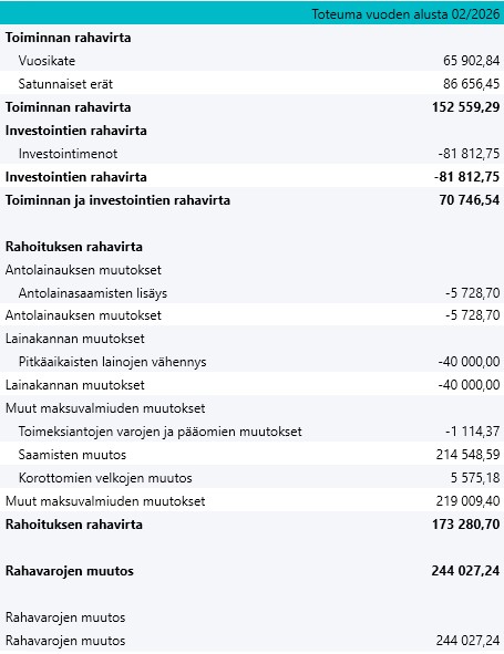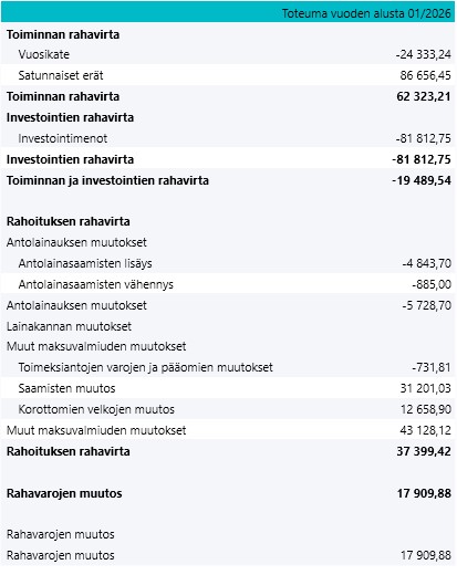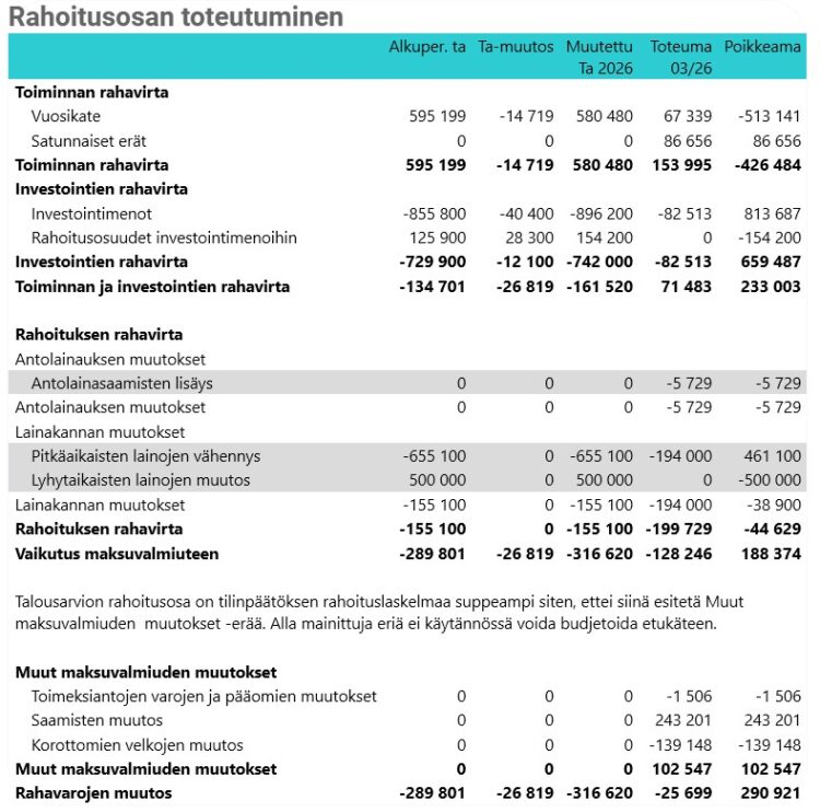 Rahoituslaskelmaosassa yhdistetään tuloslaskelma- ja investointiosa sekä lainanlyhennykset ja osoitetaan näissä tarvittava rahoitus sekä maksuvalmiuden muutos vuoden aikana.