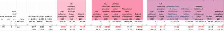 Mennäänpä sitten tarkastelemaan valtionosuuksien ns. sote-eriä. Lemin kunnan sote-erät ja valtionosuusvaikutus ovat melkein miljoona euroa pakkasella, verrokkikunnan vastaavat yli kaksi miljoonaa euroa plussalla. Eli kuntien välinen ero on yli kolme miljoonaa euroa.